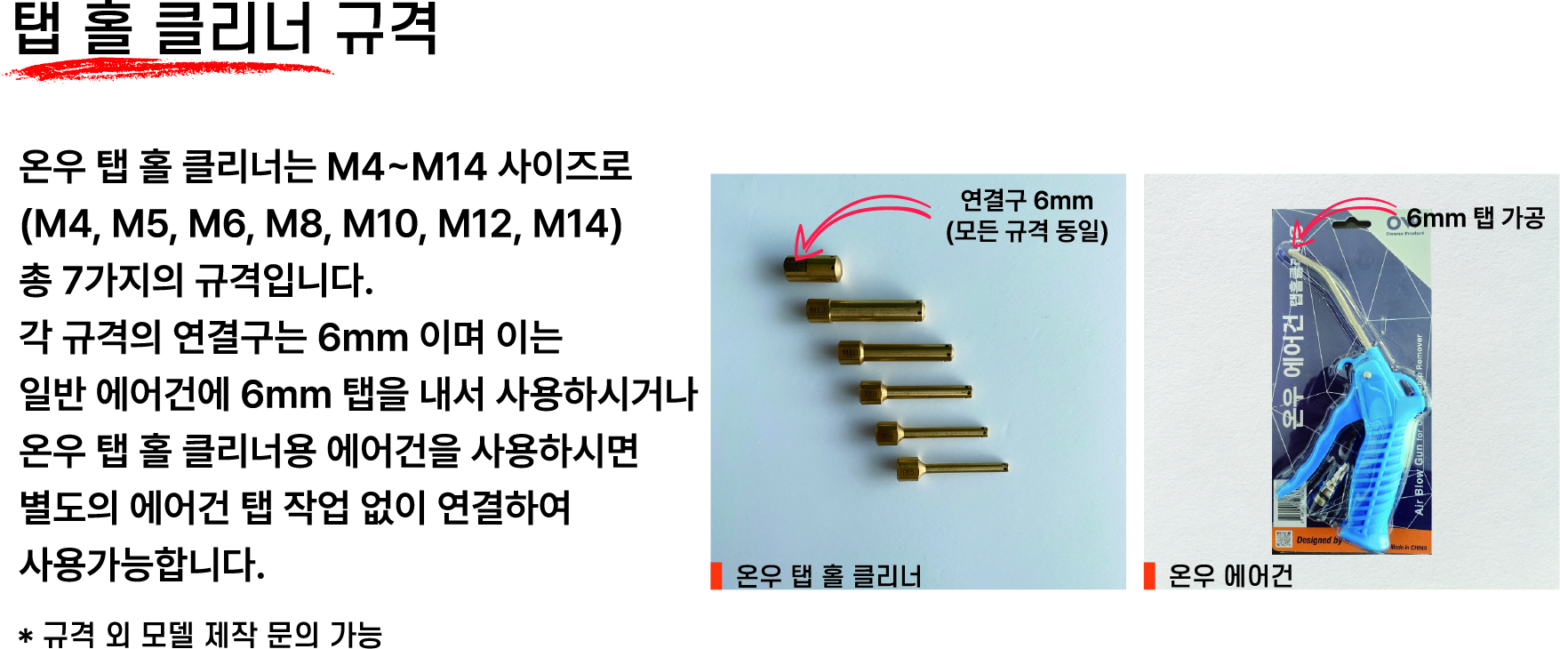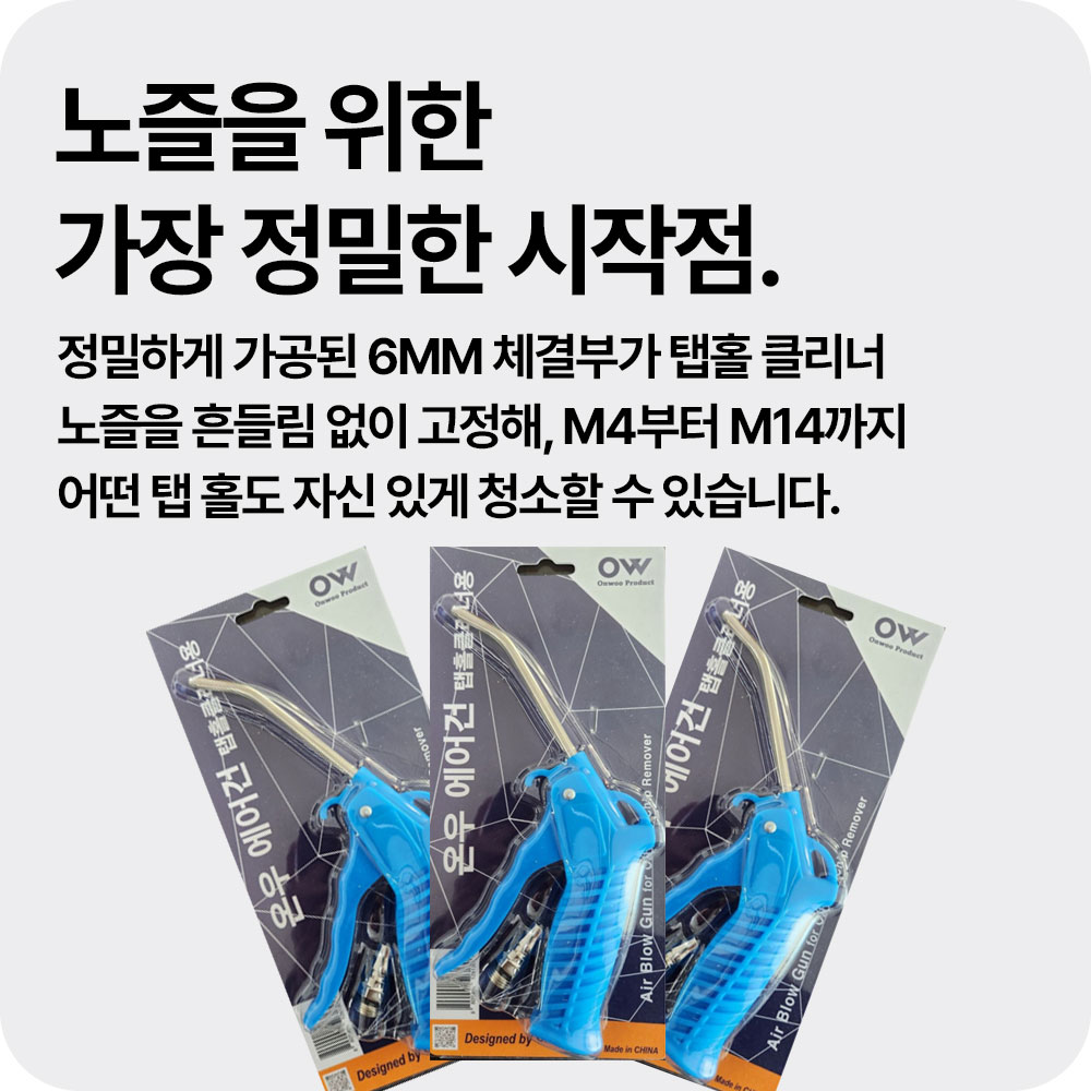 탭 홀 클리너 노즐은 6mm 규격 홀 가공을 기준으로 제작되어 있습니다.