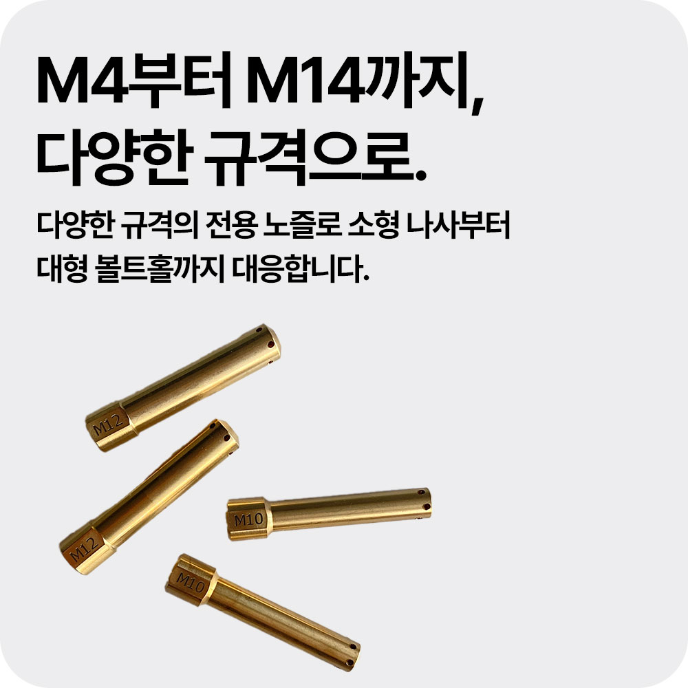 M4부터 M14까지 다양한 탭홀 클리너 노즐을 빠르게 교체할 수 있습니다.